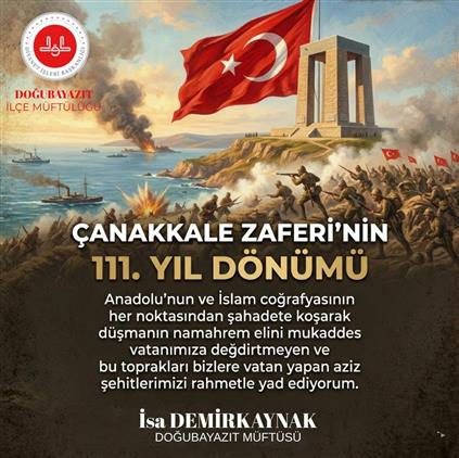 18 Mart Çanakkale Zaferi ve Şehitleri Anma Günü münasebetiyle müftümüz kısa bir anma mesajı yayınladı: Çanakkale Zaferi’nin 111. yıl dönümünde Anadolu'nun ve İslam coğrafyasının her noktasından şahadete koşarak düşmanın namahrem elini mukaddes vatanımıza değdirtmeyen ve bu toprakları bizlere vatan yapan aziz şehitlerimizi rahmetle yad ediyorum.