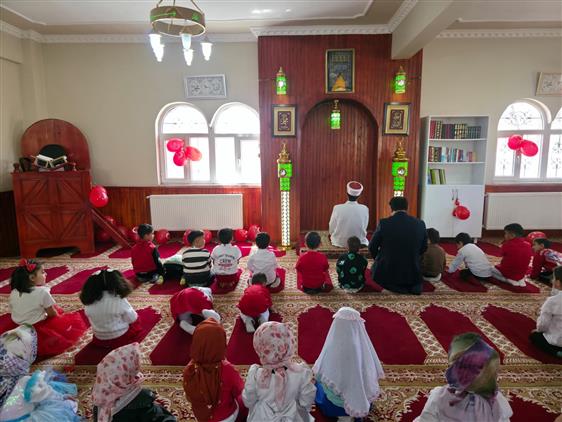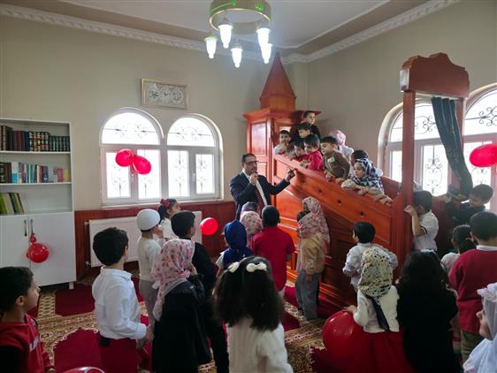 İsra Mirac Kur'an Kursu’nun 4-6 yaş grubu minik öğrencileri, Miraç Mescidi’nde düzenlenen özel bir cami buluşmasıyla unutulmaz bir gün yaşadı. Caminin manevi atmosferini neşeli balon oyunlarıyla birleştiren etkinliğe İlçe Müftümüz Sayın İsa Demirkaynak da katılarak çocukların heyecanına ortak oldu. Her bir çocukla yakından ilgilenen ve onlara isimleriyle hitap eden Müftümüz, miniklerle birlikte balon oynayıp caminin bölümlerini teker teker gezdirerek İslam’ın güler yüzünü ve cami sevgisini çocukların kalplerine nakşetti.